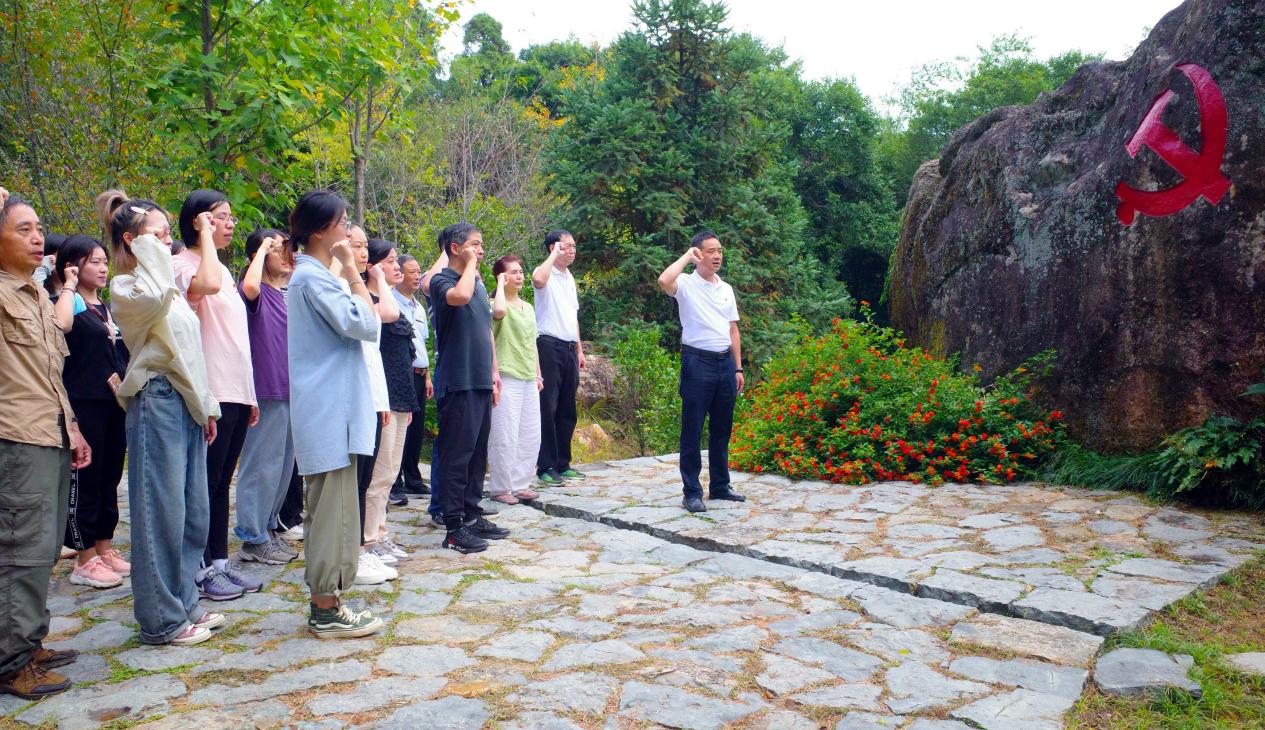 温誓言,铸忠诚。在闽浙赣五县中心县委游击队联络站旧址,党员们高举右拳,庄严重温入党誓词。一句句铿锵有力的誓词,再次点燃在场每一位党员心中爱党、爱国、忠诚、担当、奉献、敬业的激情。进一步牢记初心使命,坚定理想信念。
