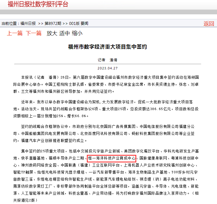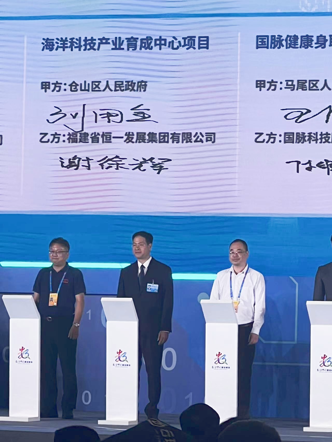 在集中签约活动中,福州市仓山区委副书记、区长刘用全,恒一公司党委委员、副总经理兼恒一置业公司董事长谢徐辉分别代表双方上台签约海洋科技产业育成中心项目。
