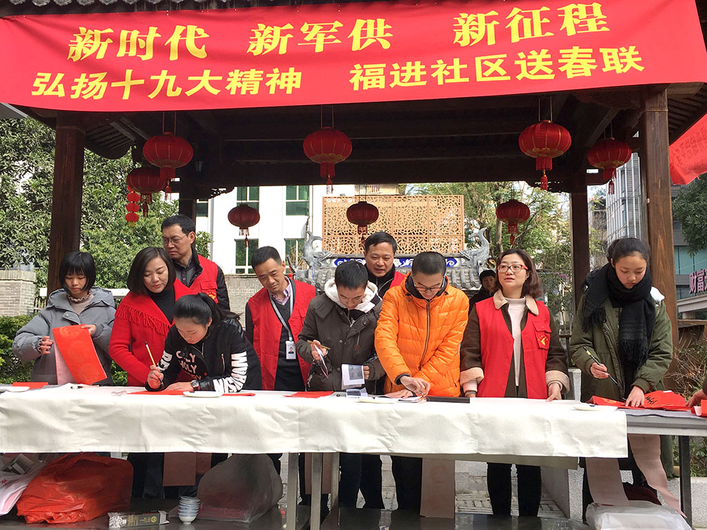 为宣传十九大会议精神,营造节日氛围,弘扬传统文化,给社区居民送春联、送祝福活动,辖区居民踊跃参与,气氛热烈。一幅幅苍劲有力、洋溢着新春祝福的春联跃然纸上,吸引了不少居民前来围观喝彩,拿到春联的群众更是笑得合不拢嘴。恒一集团以一幅“恒于进取再创业建设新国企,一心一意谋发展更上新台阶”对联,表达了感谢党和政府对国企发展好政策的喜悦之情。