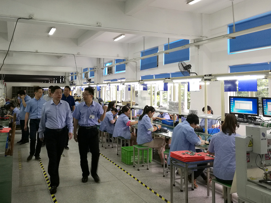 林升董事长一行首先来到安模公司制模车间和注塑车间参观了模具加工制作流程,并在600吨级卧式注塑机前观看生产过程。接着又来到安远公司装配车间实地考察汽车空调开关总成装配线和POS机及扫描枪的装配生产线,详细了解生产情况和产品工艺流程,还饶有兴致地来到安远公司新建成的恒温、恒湿、无尘防静电车间,观看SMT贴片机制作演示,了解调试情况。